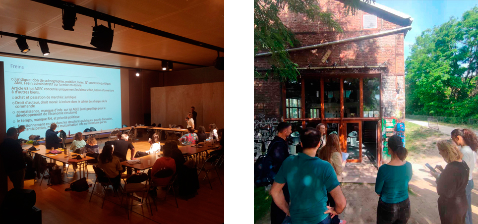 A gauche, groupe de travail de la filière de valorisation des biens culturels à la Philharmonie de Paris. A droite, visite apprenante de lieu exemplaire (chantier circulaire) au TLM, 19e arrondissement.